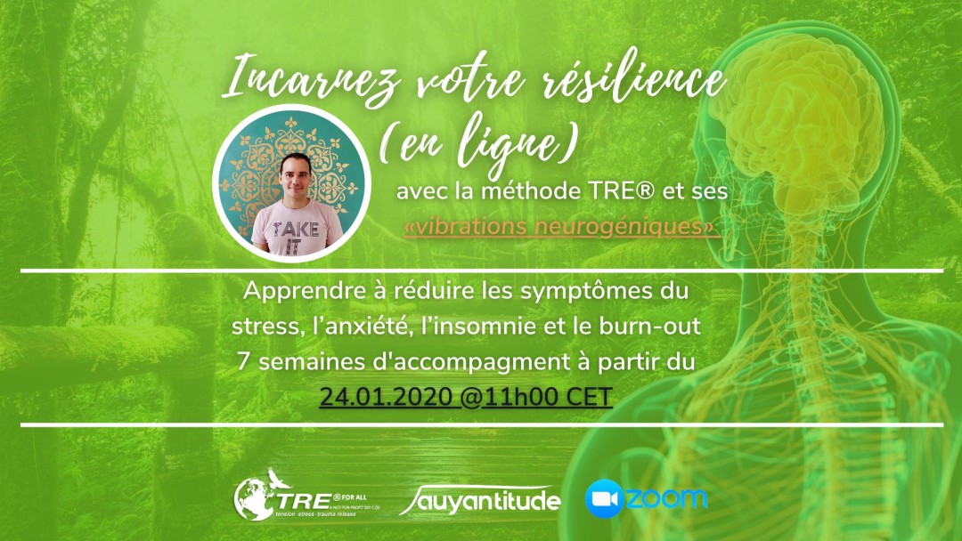 Vu le nombre de personnes inscrites que n’ont pas pu se libérer pour participer à la séance d’information du 15.12.2020 à 18h30, je vous partage (exceptionnellement) l’enregistrement ici de la séance d’information du programme de coaching de libération de stress «Incarnez votre résilience avec le TRE® et ses vibrations neurogéniques».